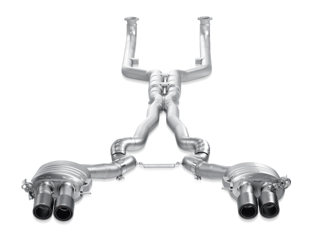 Die aus exklusivem Titan gefertigte Evolution-Abgasanlage verfügt über neu entwickelte Doppelendrohre mit Abgasklappen, strömungsoptimierte Rohre und ein einzigartiges Titan-Guss-Kreuzstück mit Resonatoren. Der reduzierte Abgasgegendruck sorgt für mehr Leistung über den gesamten Drehzahlbereich des M6. Das Ansprechverhalten wird verbessert und ein besseres Leistungsgewicht erzielt, ohne dass die Katalysatoren entfernt werden müssen. Die Evolution Performance-Abgasanlage liefert einen tiefen, sportlichen Klang, der bei sportlicher Fahrweise in ein aggressives Grollen übergeht – ohne dabei störend zu wirken. Sie harmoniert perfekt mit dem ANC-System des M6, ebenso wie das Klappensystem, das über die Einstellungen des M6 gesteuert wird. Abgerundet wird der Look durch vier atemberaubende Endrohre aus Titan oder Carbon.
