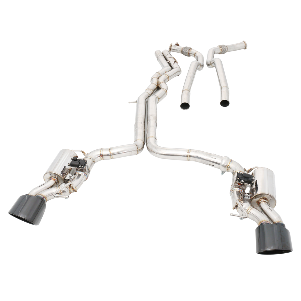 Transformeer het geluid van je Audi RS6 / RS7 C8 met het Endura Motorsport Catback Uitlaatsysteem van duurzaam RVS304. Kies voor gebruik van de originele Audi kleppenmotoren (overzetten vanaf je OEM uitlaat, automatische werking zoals af-fabriek) of voor Endura kleppenmotoren met afstandsbediening (handmatige bediening: stil of agressief). Het systeem loopt van het einde van de downpipes tot en met de tips, gebruikt 2× 76 mm buizen, heeft een centrale X-pipe voor optimale flow en sound, en flexdelen in de midpipes om trillingen op te vangen. Volledig lekvrije connecties en probleemloze montage op OEM downpipes.